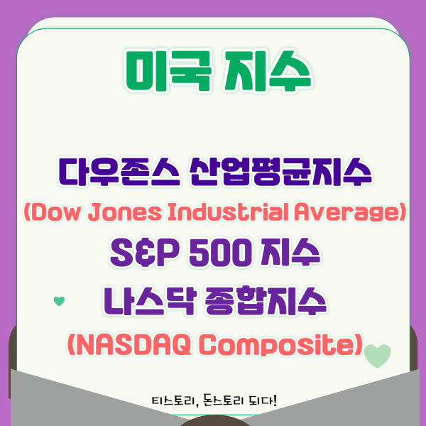 다우존스 산업평균지수(Dow Jones Industrial Average) : 미국을 대표하는 30개 우량 기업의 주가를 종합하여 산출하는 지수입니다. 전통적인 제조업 및 금융 기업 중심이었으나, 최근에는 기술주 비중도 높아지고 있습니다.