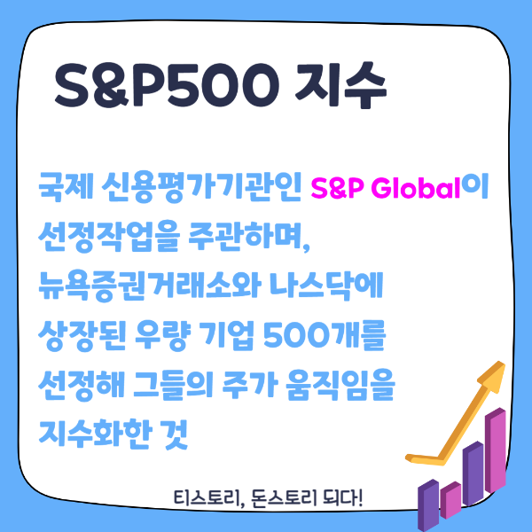 이 지수는 국제 신용평가기관인 S&P Global이 선정작업을 주관하며, 뉴욕증권거래소와 나스닥에 상장된 우량 기업 500개를 선정해 그들의 주가 움직임을 지수화한 것이죠.